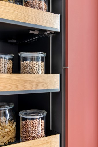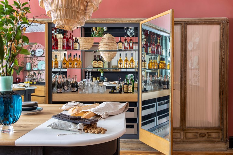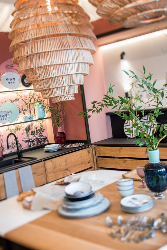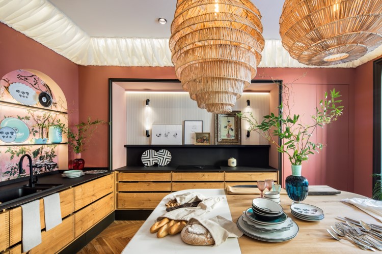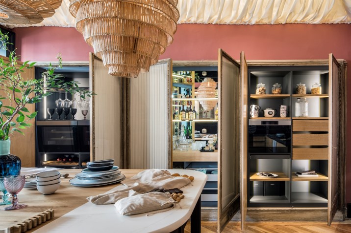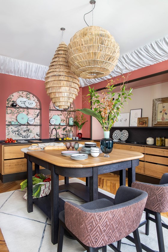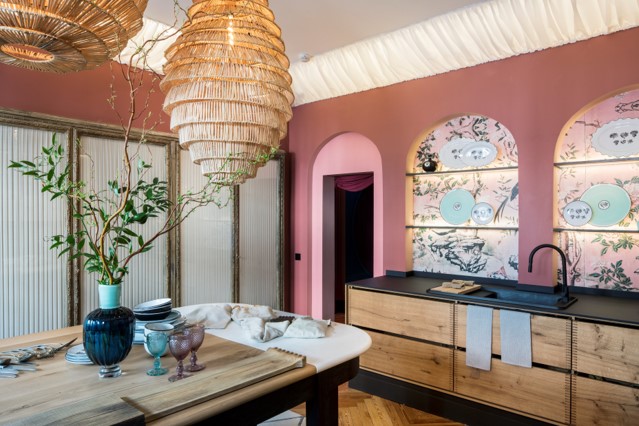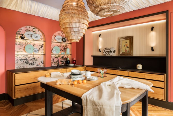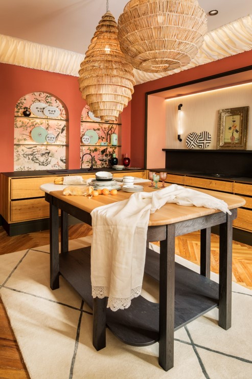 Para unificar todos los elementos elegimos un papel pintado con motivos muy delicados en rosas y sienas. Y para romper, la potencia bruta del modelo Zura que, claramente, contrarresta el espacio. Aportando calidez al entorno, irrumpe una mesa/isla de madera diseñada por dosde-taller, que invita a que la cocina acoja en su seno la vida del hogar.